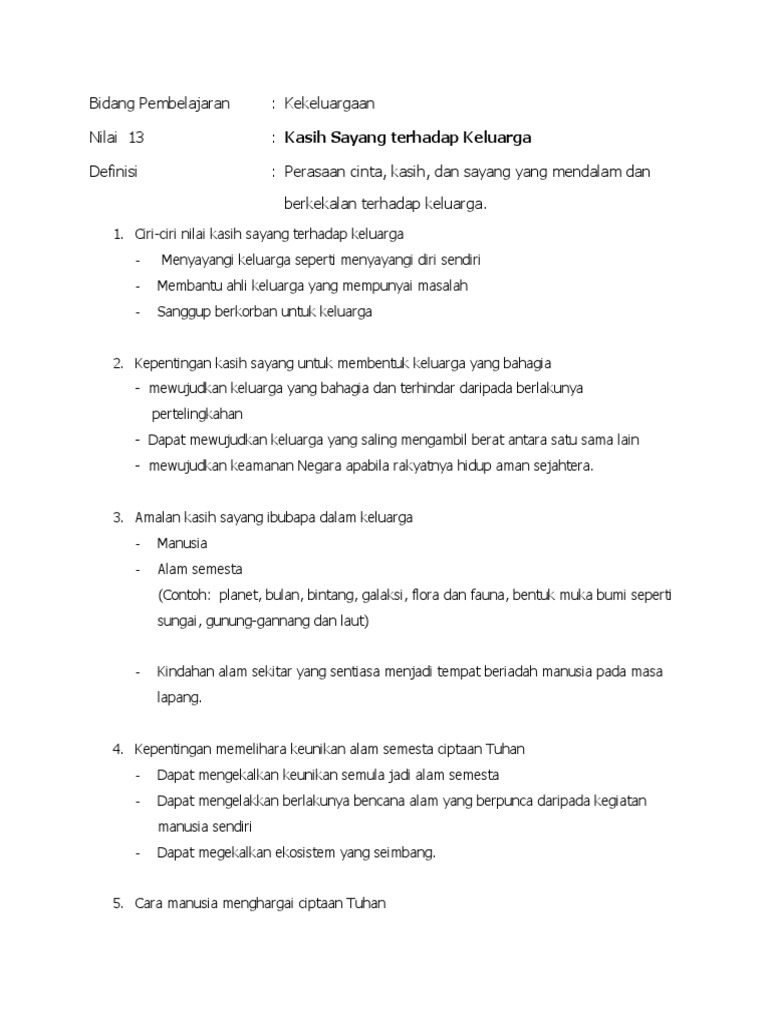 Tugas bapa adalah untuk mencari nafkah untuk keperluan segenap isi keluarga malahan ibu pula telah melahirkan kita. Nilai yang seterusnya ialah nilai kasih sayang. KB Menghubungkaitkan KP Verbal-linguistik Bernyanyi dan Berlakon Oh oh oh keluargaku Keluargaku Sayangku Marilah kawan mari semua Marilah kita sayangi keluarga 2 kali Kasih sayangmu kasih yang suci 2 kali Keluarga kita bahagia selalu Hai hai hai sayangku.